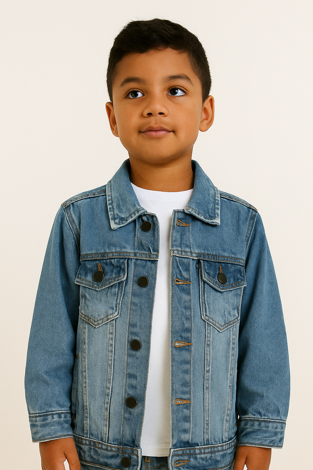 Kids' Medium Wash Denim Trucker Jacket with Button Closure and Pockets.